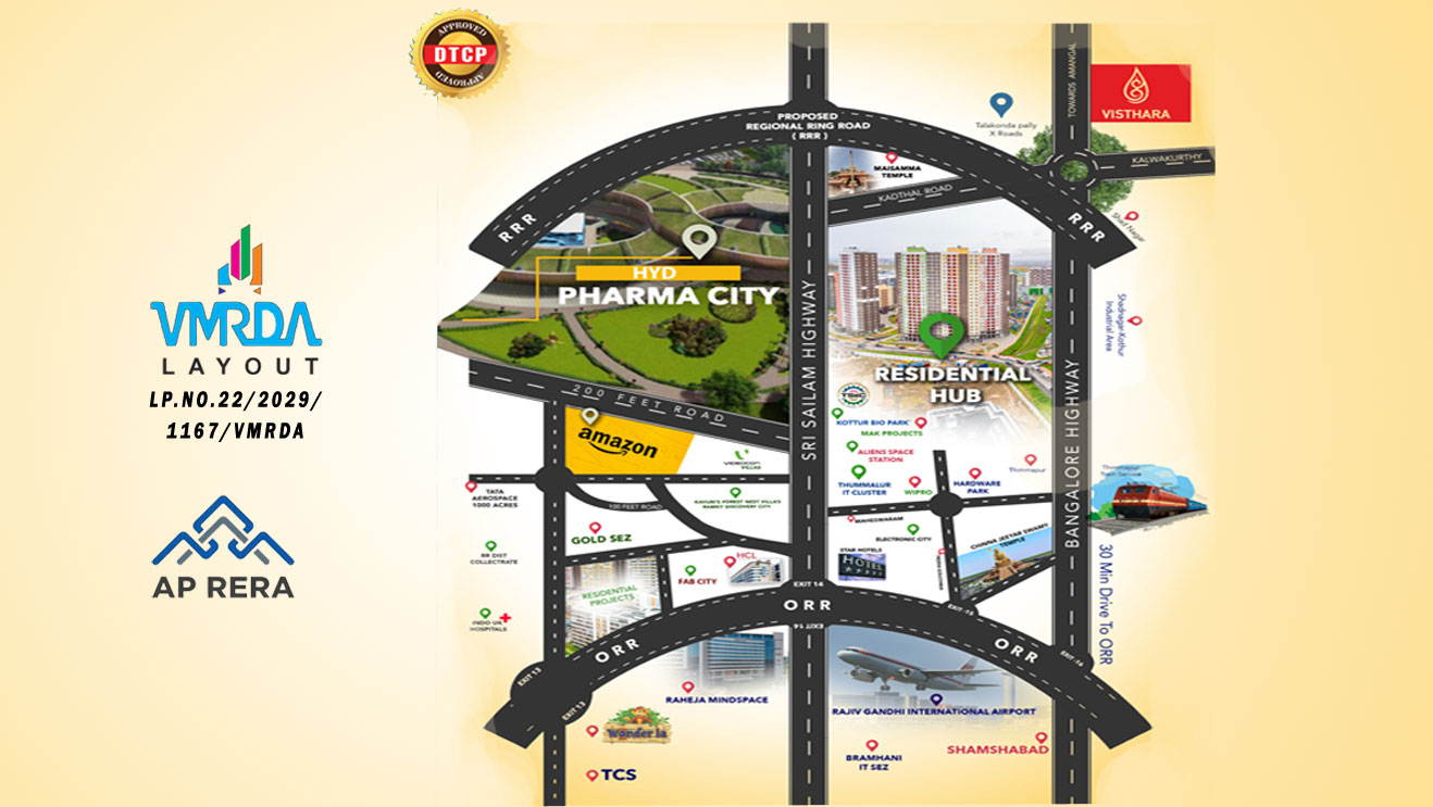 Senapathi Visthara is a DTCP & RERA approved residential layout project, located at Talakondapally, Srisailam Highway, facing a 100’ road that goes to Shadnagar. This project is developed in 16 acres and has pollution free environment, perfect to live comfortably with your family. Senapathi Visthara has obtained all necessary approvals from concerned authorities. The TLP No. is 116/2022 / H.