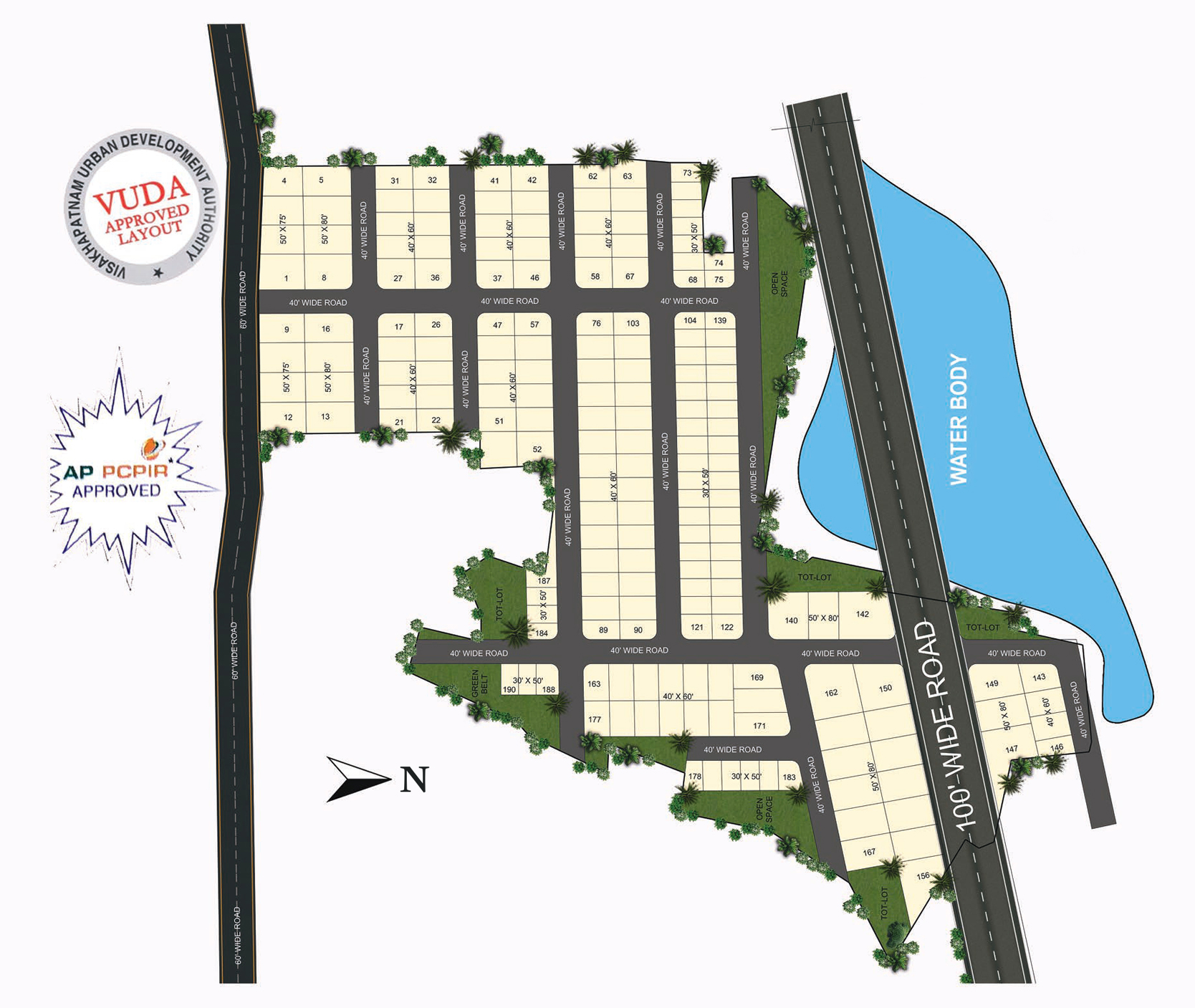 • A fully VUDA approved layout, 'Temple Trees' offers a total of 191 residential plots in 30x50' / 40'x60 / 50x75' and 50'x80' size options. The plots come with site clearance and boundary demarcation with CC stone.