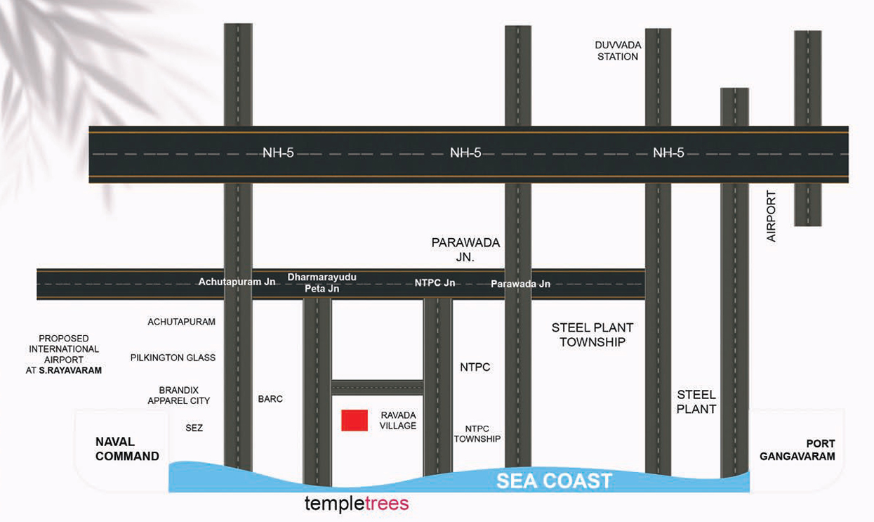 "Temple Trees' is a fully VUDA approved venture offering residential plots in a 20-acreexpanse of land in Ravada under Parawada Mandal. Temple Trees' is an extension of Ravada village, within a stone's throw from NTPC Simhadri and 9 kms off NH5. The plots are set in absolutely serene and sylvan surroundings, away from the noiseand pollution of the city. Yet, within striking distance of Vizag Special Economic Zone (SEZ), Brandix Apparel City, Vizag Steel Plant and Rambelli Naval Base in the Achutapuram to Yelamanchili belt.