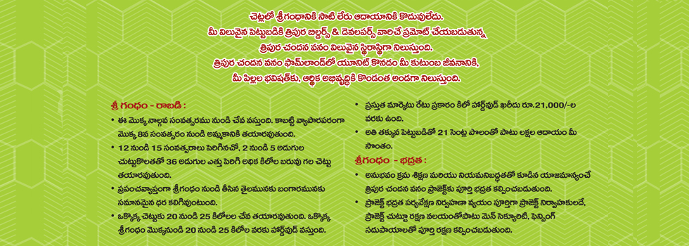 Located near the Chennai - Kolkata highway, Tripura Chandanavanam is a 50 acre farm land venture where mainly Sandalwood (Sri Gandham) is cultivated. There are primarily two plot sizes, 10.5 cents and 21 cents, respectively. Investing in this venture is bound to yield massive results.